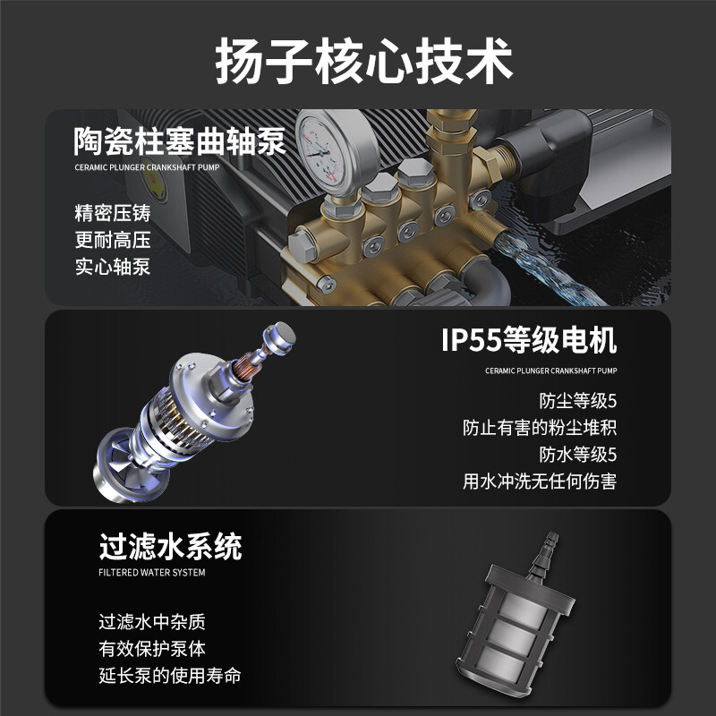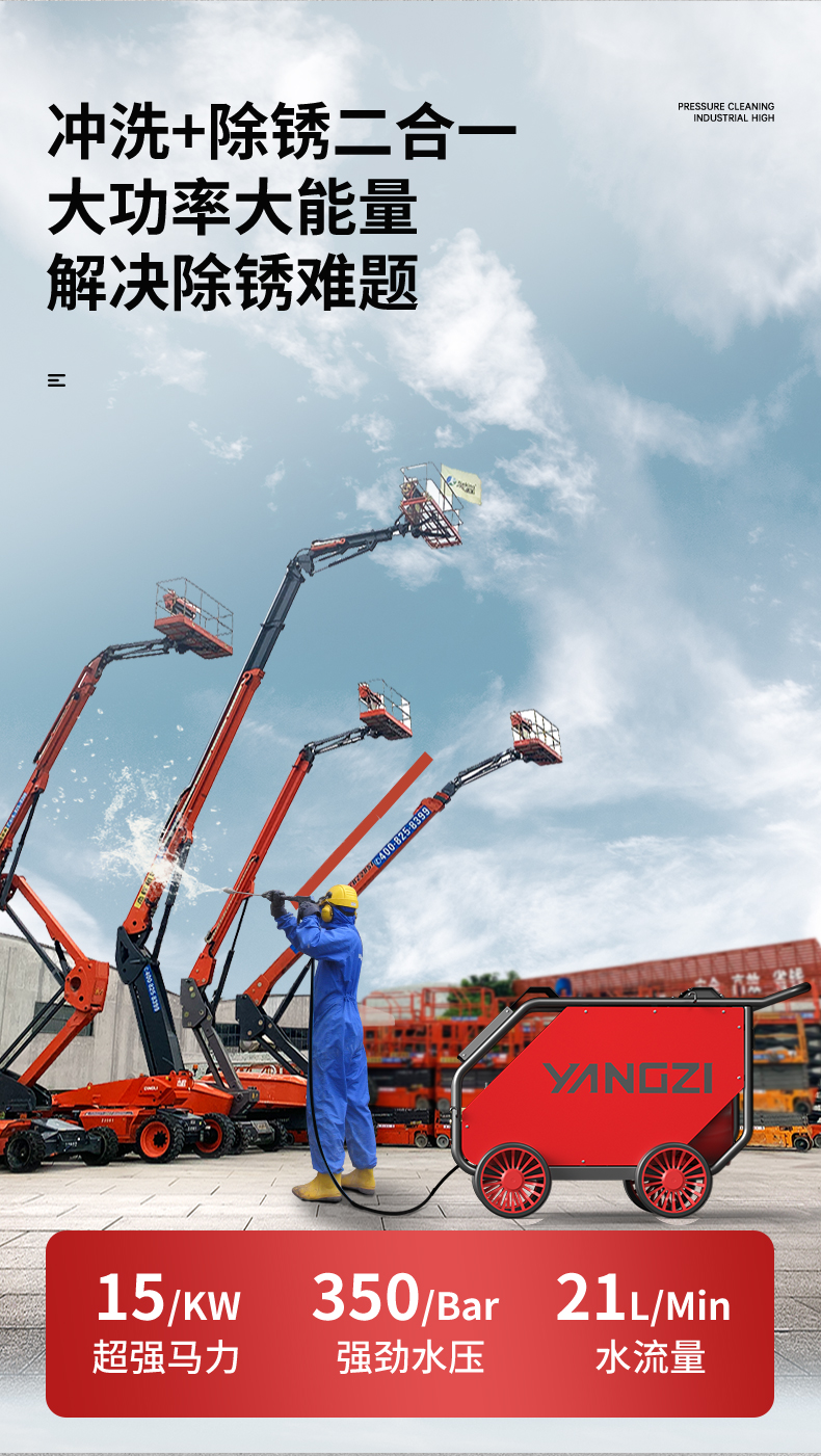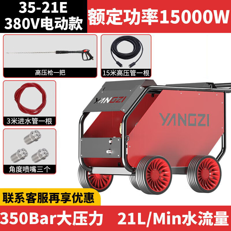 揚子YZ35-21E電動高壓清洗機廣泛應用物業(yè)小區(qū)、工業(yè)化、城市、酒店后廚等污水管道疏通清洗,沖洗+除銹二合一大功率大能量解決除銹難題