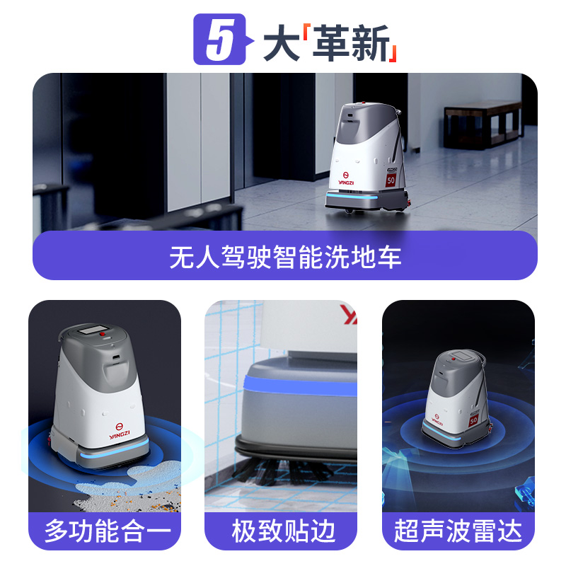 揚(yáng)子YZ-SC50無人駕駛洗地機(jī)AI智能識(shí)別、全自動(dòng)作業(yè),洗地、塵推、掃地等多種功能可選,智能清潔可自動(dòng)充電、排水、加水、避障等。